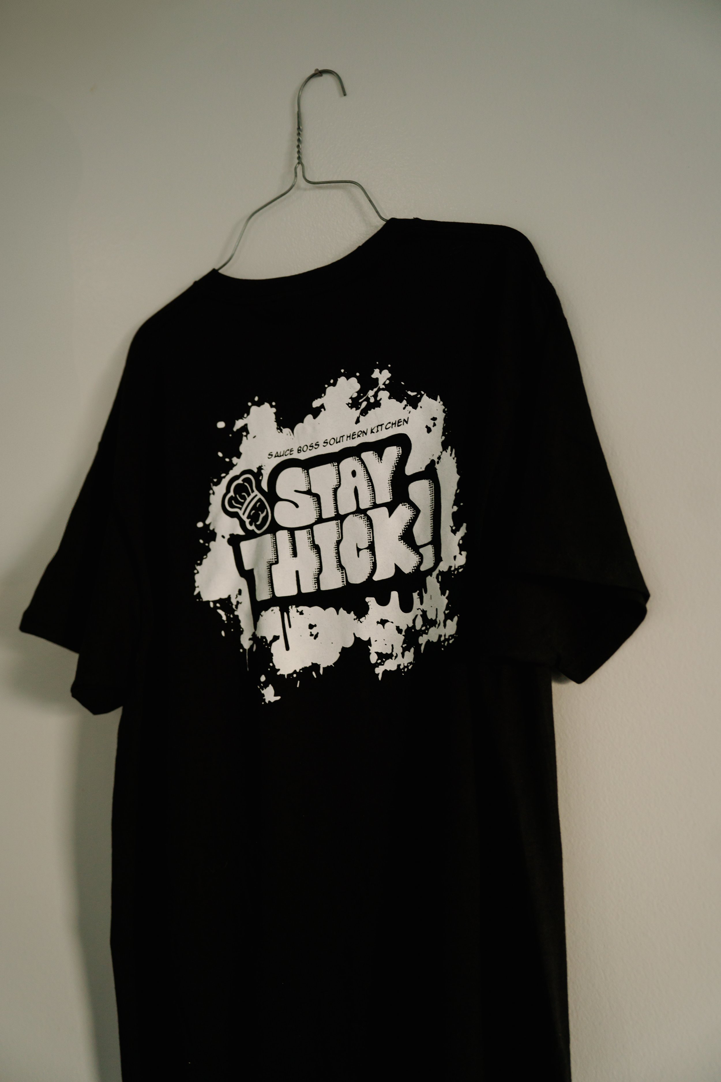 Show your love for Sauce Boss Southern Kitchen with this comfortable and stylish t-shirt. Perfect for any occasion, this shirt features a bold "Stay Thick" slogan and the iconic Sauce Boss logo.